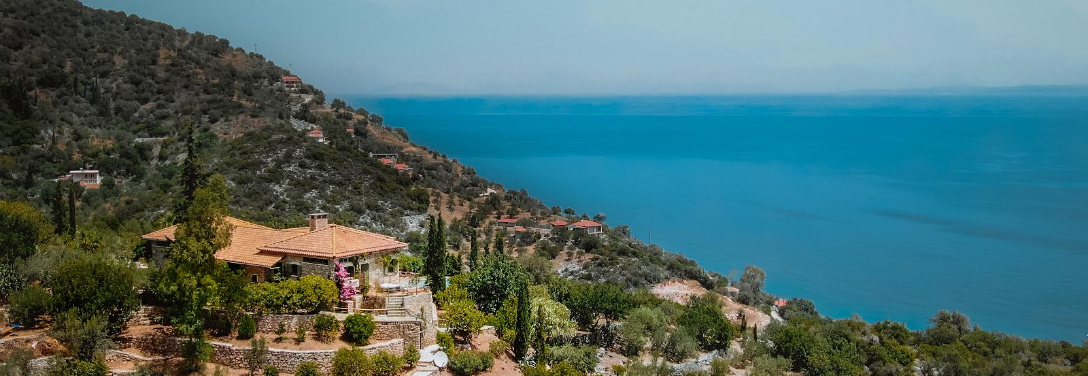 Im Rücken das Hochland, das Meer und die Sonne zu Gesicht, bettet sich der Hügel von Agios Kosmas in die Landschaft ein. Herrlich duftende Orangen und Zitronenbäume, weitläufige Olivenhaine und das tiefblaue Meer prägen die Natur.